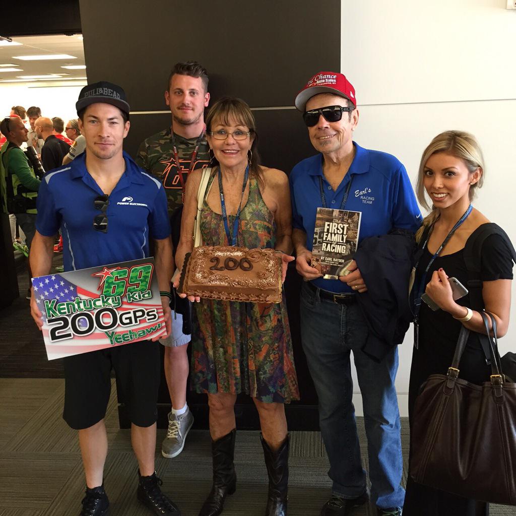 Nicky Hayden ha asistido luciendo una camiseta azul con el nombre del sponsor "Power Electronics" y nada más empezar la sesión han aparecido Rose y Earl, padres de Nicky, con una tarta y un cartel para conmemorar el 200º Gran Premio del piloto americano. Nicky recibió a su madre con un beso y posó para las foto entre aplausos de los asistentes.